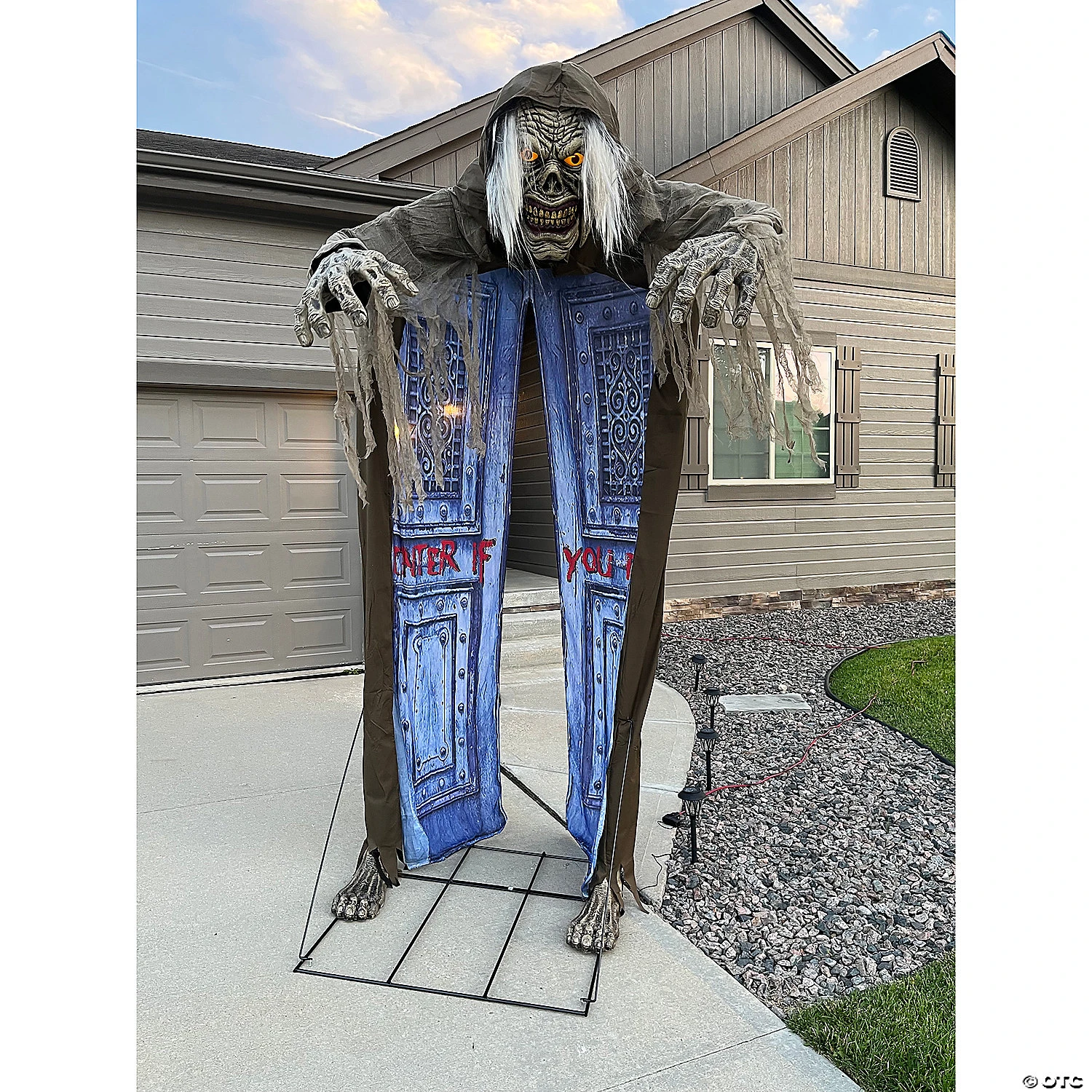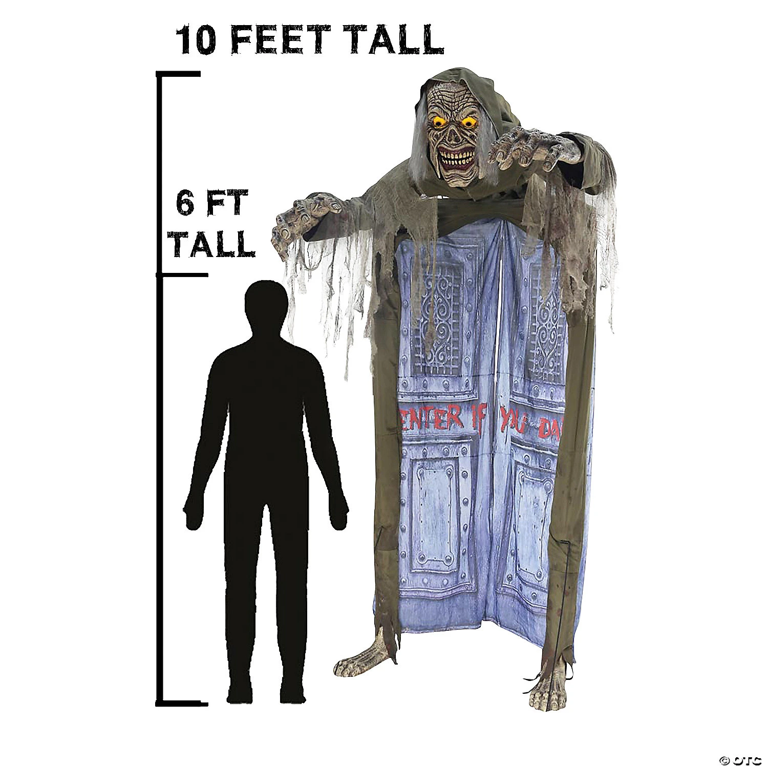 Here is a ghoulishly delightful Halloween door decoration! Standing at a colossal 10 feet tall, the Looming Ghoul Animated Walkthrough Prop will wow your guests at your next Haunted Gathering! Make a creepy Halloween Archway Entrance to your party and have your guests enter through the printed curtain under his tall spindly legs! His yellow eyes light up, his torso rocks, and his mouth moves as if he is speaking to you! Speaks 5 different phrases! Leg height is adjustable to fit within most standard ceilings. Easy Assembly and Convenient Activation options make this a Great Animated Halloween Prop! Indoor or covered-porch use only.br /br /strongMultiple activation options:/strong Steady-on, Infra-red, or Step-Here Pad (included)br /strongPower source:/strong UL power adapter