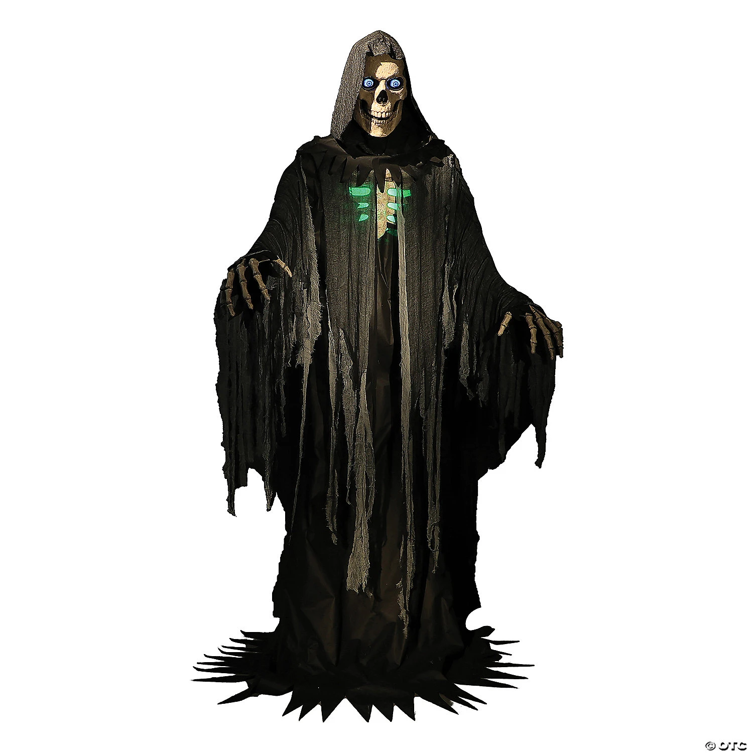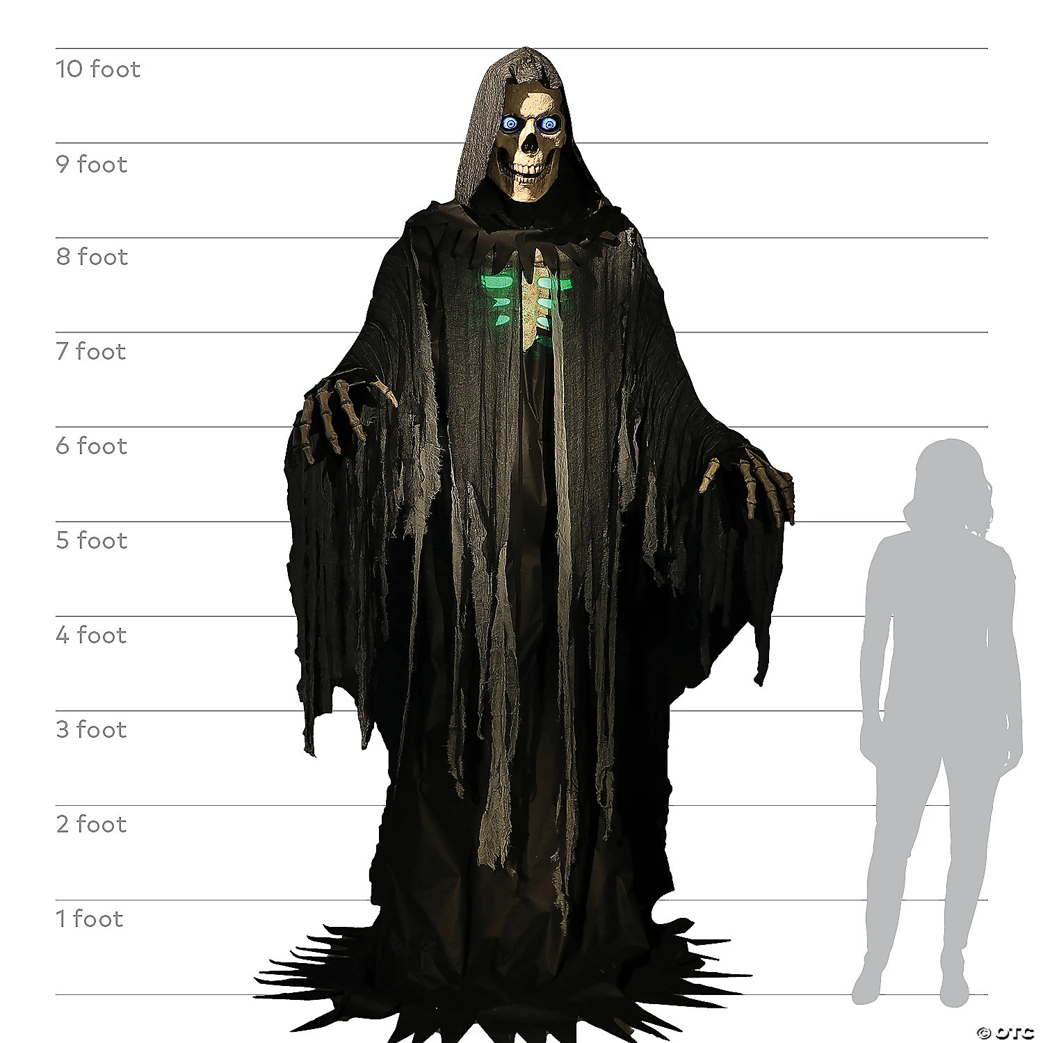 Add a real “Wow” factor to your haunted scene with this 10 foot tall Towering Reaper Animated Prop! The mood is set with the sighing, moaning wind in the background, as well as the eerie sounds of crows cawing, cats screeching, and owls hooting. His Turning Head and Moving Jaw are highlighted by his innovative Patented Digiteyes technology (Illuminated digital eyes that appear to look around and blink at you). The Reaper has a rich, deep persuasive voice that says his haunting phrases:Phrase #1: “Hahah welcome to the afterlife! Beware all ye who enter here.”Phrase #2: “Go ahead and live a little, it is later than you think. I will be coming for you soon enough hahaha.”Phrase #3: “Look who comes this way &ndash and I thought I was trouble hahaha! It is almost time for me to take another soul &ndash will it be yours?”Phrase #4: “Before you are doomed, save the last dance for me, hm? We’ll dance our way to oblivion, you and I. “The Towering Reaper Animated Prop has a blow-molded head and hands, and his Chest Lights Up a glowing green. He has several Activation Options: Steady-on, Infra-red Sensor, or Step-here Pad. There is also a Volume Control that allows you to adjust according to your setting needs. Included is a Universal Adaptor with 4 interchangeable plugs, which works in USA, UK, Germany, and Australia.