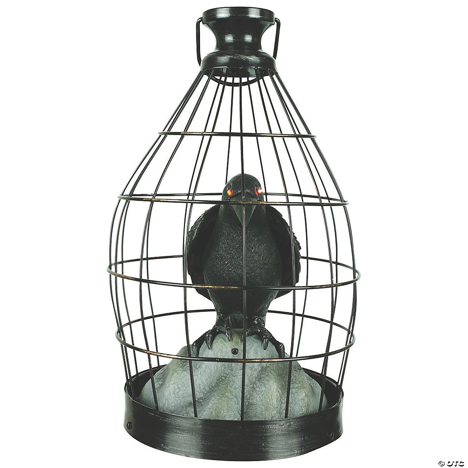 This creepy caged black crow flaps its wings and squawks when someone is near. Welcome guests to your Halloween party with this frighteningly unique Halloween decoration. This crow is also a fantastic prop for a haunted house. From his metal prison, your new feathered fiend watches the world with glowing eyes. Sound and motion activated. Requires 3 AA batteries, not included.
