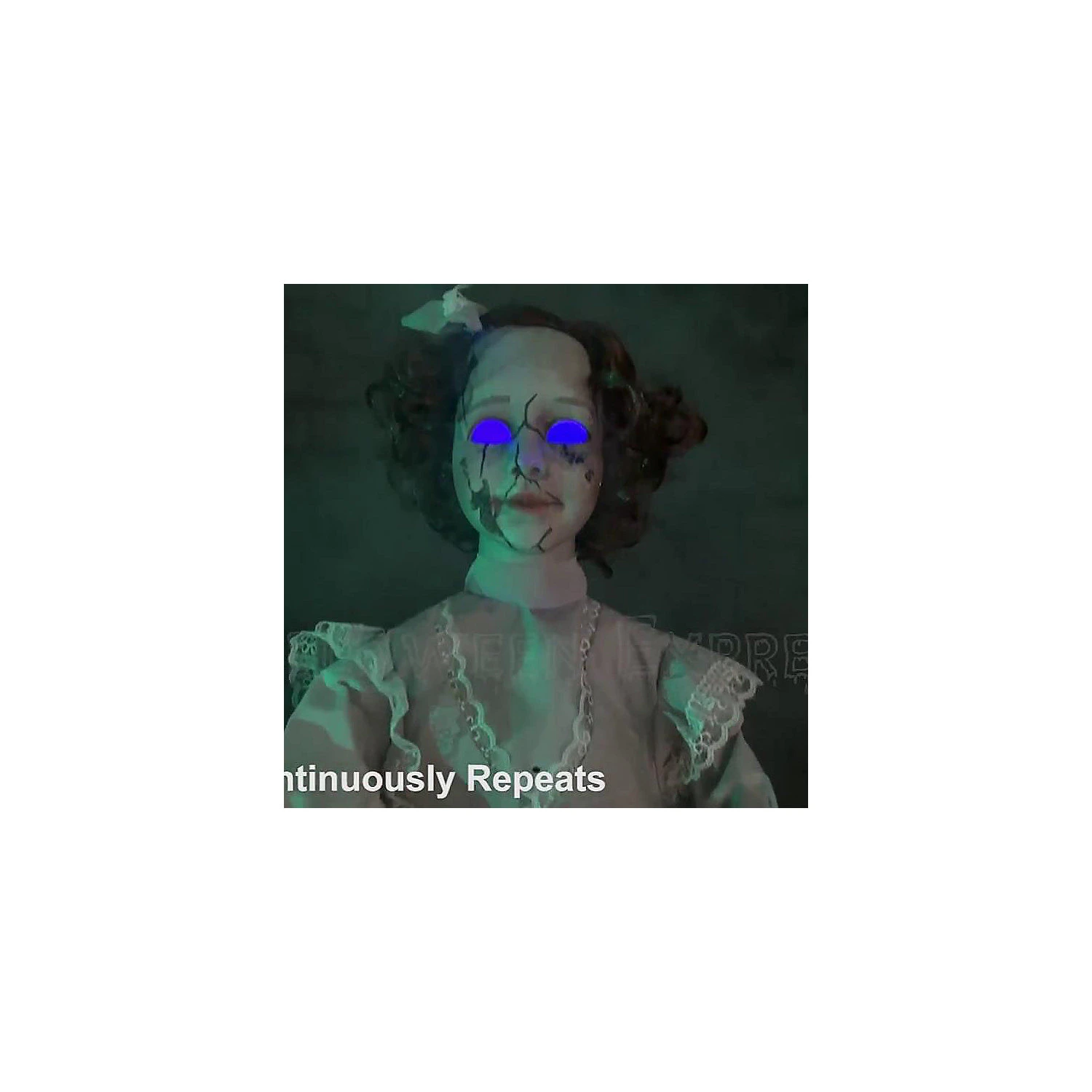 Cracked Victorian Doll Prop. The perfect addition to any haunted house or horror themed party! Standing at 32″ tall, the hollowed-out eyes of this static dreadful doll prop will glow an eerie blue as she says one of five phrases with each activation of her motion/light sensor such as “(Giggle) I just was thinking how funny you would look without eyes, too.”, “Sally was mean to me, once. Now..she ft.ll never be mean again (giggle).”, “Ring around the rosy, pocket full of posiess, ashes, ashes we all fall down”, “Hello there. “Giggle”, “I see you.” Features easy q.uick-connect push-button assembly posable arms.Requires 3 AAA batteries (not included).Special Shipping Information: This item ships separately from other items in your order. This item cannot ship to a P.O. Box. This item may be subject to additional processing days.ITEM IS NOT ELIGIBLE FOR EXPEDITED SHIPPING