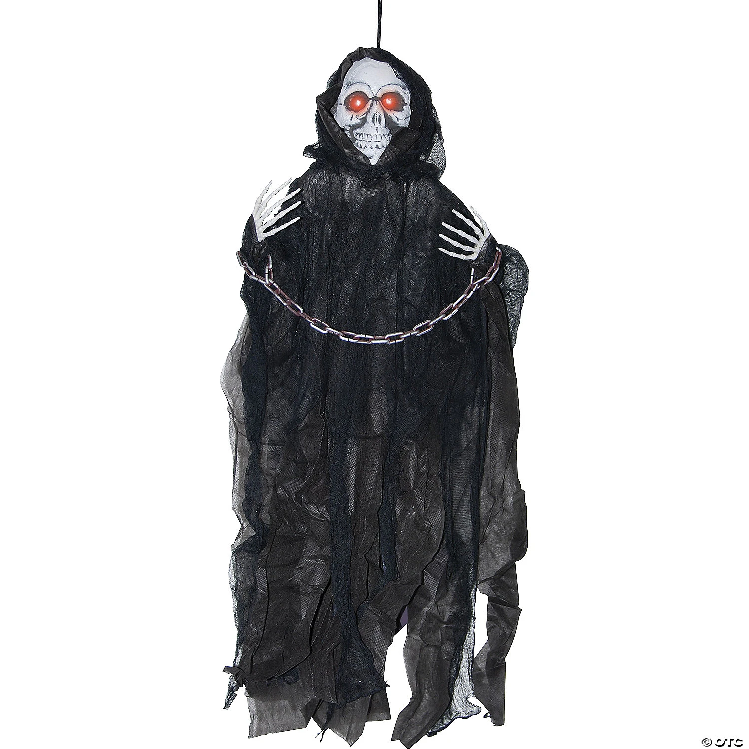 Hanging Reapers In ChainsA fearsome addition to your haunted house or home haunt! Include: Skull and skeleton hands draped in black robe with chain attached to wrists. Eyes light up. Measures: 36 x 26 x 3″. Uses 3 AG13 watch batteries which are not included.