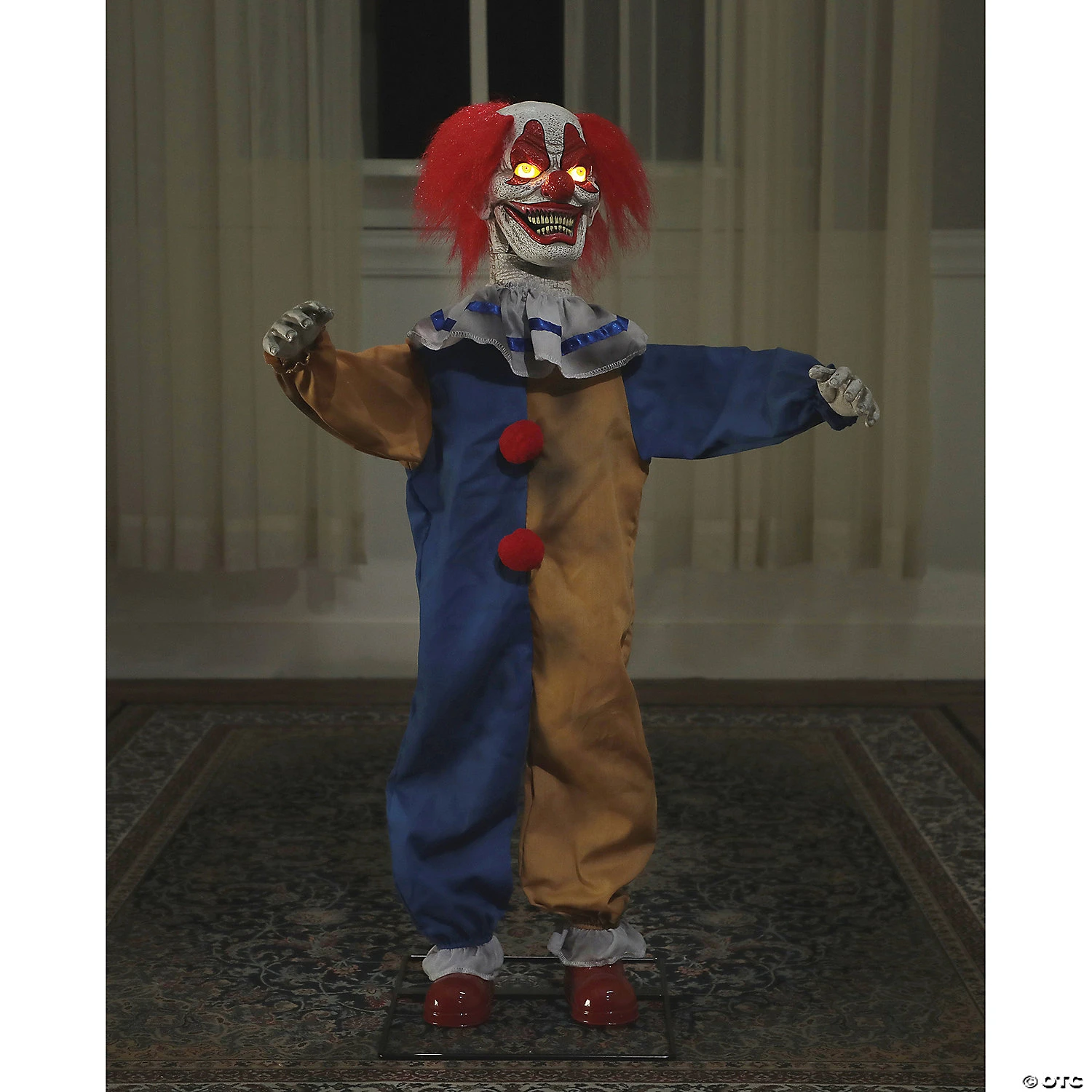Make way for the Funniest creepy clown ever! This 36-inch Little Top Clown Animated Prop will make all your guests roar with laughter! His Arms Wave back and forth, his Head with Yellow Light-up Eyes Turns, and his wide colorful Mouth Moves while he Speaks 4 different Hilarious Phrases:Saying #1: ” Step right up kiddies, we’ve got the craziest place in town right here hahaha…” Saying #2: ” You do like the circus don’t you? You better like clowns otherwise I might just go Craazzzy! ” Saying #3: ” Who wants to play a funny little trick tonight, haha, jokesters are all welcome here. I might have a trick for you, so you better not turn your back on me hahah ” Saying #4: ” You aren’t frightened of clowns are you? haha, we think everything is funny.. even your fear of us haha… So go ahead and be scared i could use a good laugh haha! “He is made of an injection molded and blow molded plastic frame with bendable wire arms. His bright circus clown fabric costume contrasts nicely with his wild red clown hair. Motion Activated with a Try-me option. Requires 3 x AA batteries (not included).