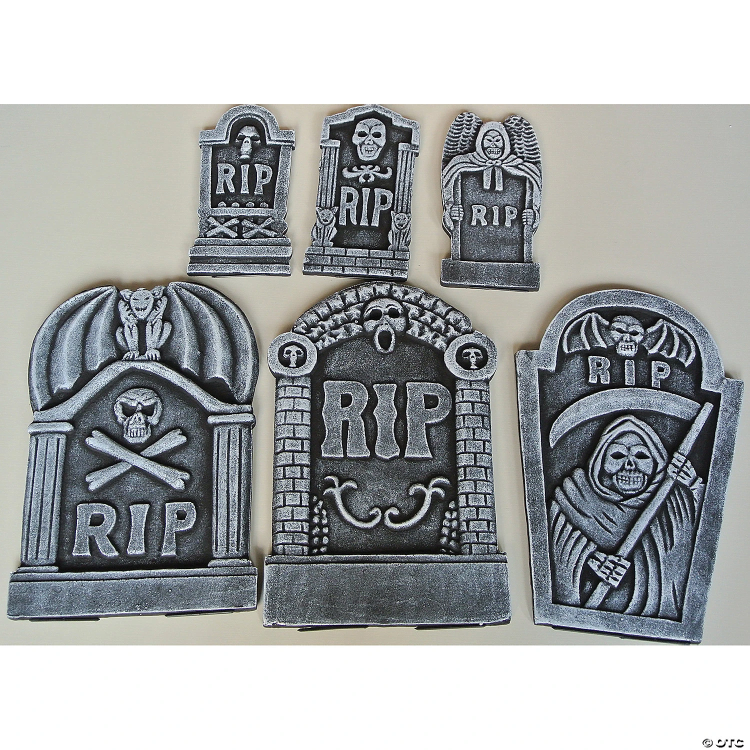 Tombstone Kit 6 Piece SetLooks like the real thing. Perfect for any haunted house or cemetery. Includes: 3 large and 3 small tombstones, to complete your haunted scene! Each says RIP in different creative designs. This measures approximately 18.9″x 12.2″x 3.1in. Made of Styrofoam(95%), and Plastic(PP)(5%).