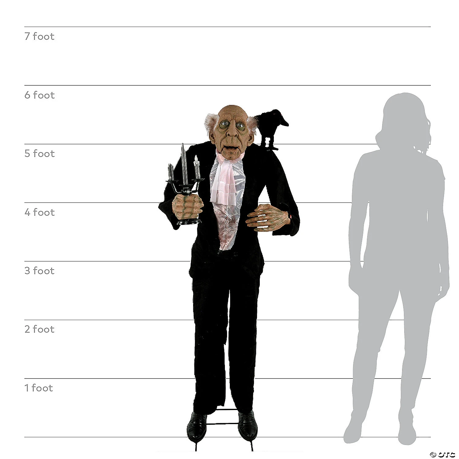 Prop. Spooky is a great addition to your haunted scene, or as a greeter when guests enter your haunted gathering! This 68-inch tall figure has a friendly raven perched on his shoulder who speaks, flaps, and has light-up eyes. In addition, the candelabra he is holding lights up, and he has a palsied, shaking head movement while speaking to add to the spooky effect. Simple assembly.