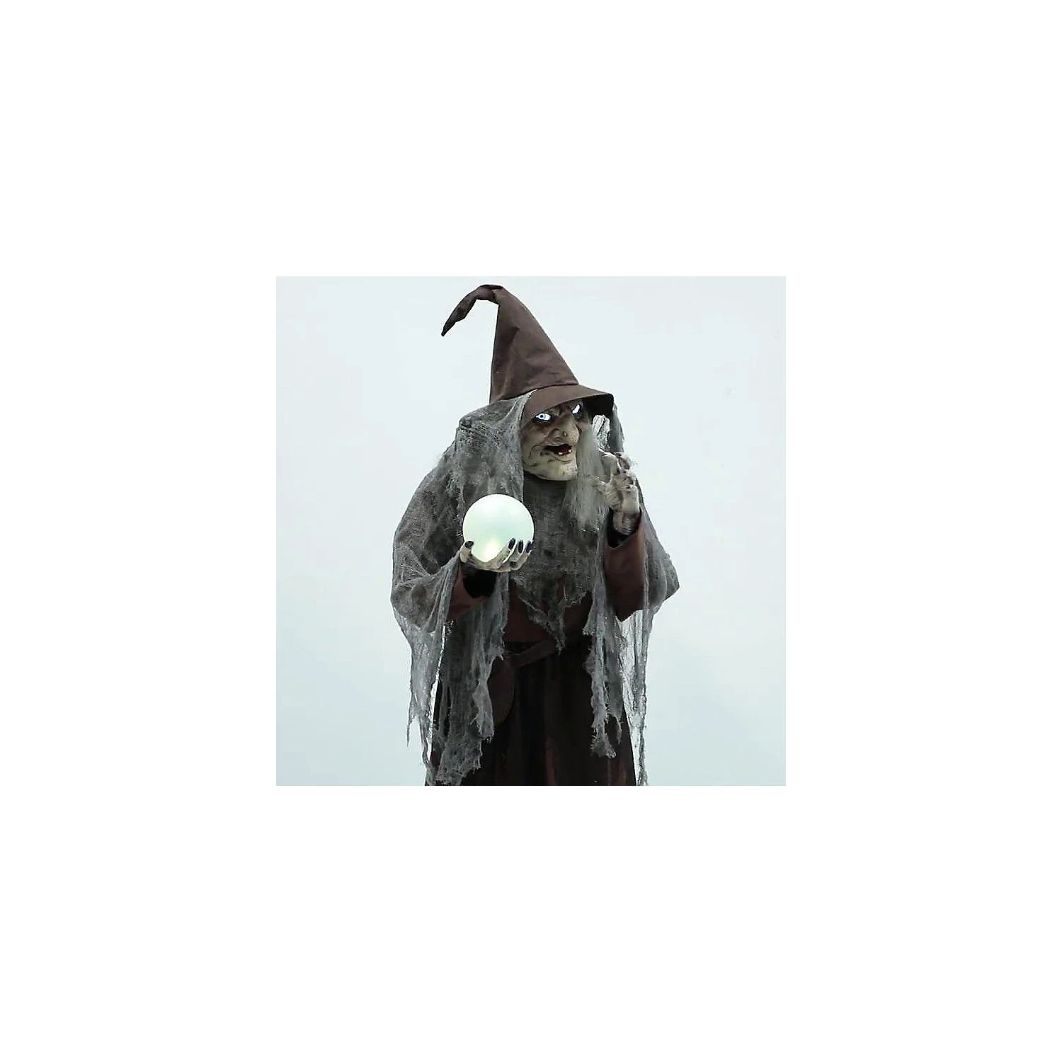 Your future unravels in the hands of a decrepit old 68-inch Digiteye Soothsayer Witch Animated Prop with dark inclinations. She grasps a mystical color-changing crystal ball, enticing spirits to draw close. Her Head Turns side to side and her Luminous Digiteyes (a patented technology) spring to life when you enter her proximity, while her hand waves back and forth. A Ragged tattered Shawl is draped around the shoulders of the crone’s aging long brown robe. Gnarly teeth protrude from the Soothsayer’s Moving Mouth as she recounts one of Five discomforting Phrases:Phrase #1: “I see the veil becomes thinner, your future becomes more clear&hellipand fraught with doom. There are many evils pulling you towards them&hellipmyself included heheheheh!”Phrase #2: “The spirits call to me from beyond the veil, they whisper things&hellipenticing things&hellipdark things&hellipthey have plans for you. You don’t have much time &ndash you best get your affairs in order&hellip”Phrase #3: “I call upon the great beyond, show me what the future holds for this fool before me. I now see the sacrifice that must be made! Your blood does not have to be given willingly &ndash in fact, I would enjoy it more if it was not hahahah!”, Phrase #4: “The voices whisper their guidance through me…they carve out two paths for you to walk. The first is to run safely away, the other is to move forward into the black abyss. Enticing choices eh?”Phrase #5: “(assorted laughs and cackles)”The Soothsayer Witch Animated Prop can be assembled standing or can also sit on a chair as you choose. Set-up is easy, assembled in less than 30 minutes with snap-together rods that do the work for you. Three different Activation Modes include Steady-On, Infrared Sensor, or a Step-Here Pad. A Volume Control allows you to adjust to your surroundings. The included Universal Adapter come