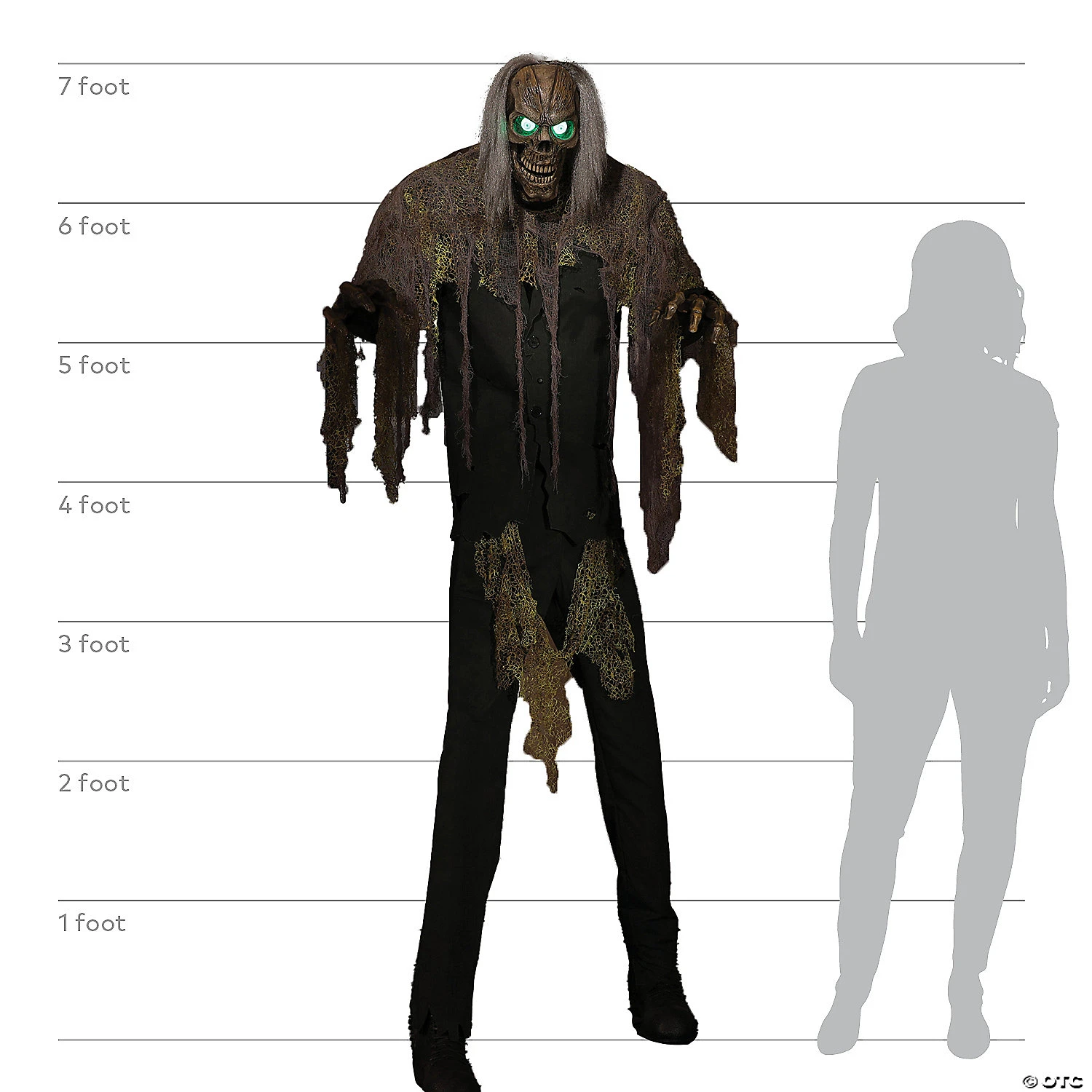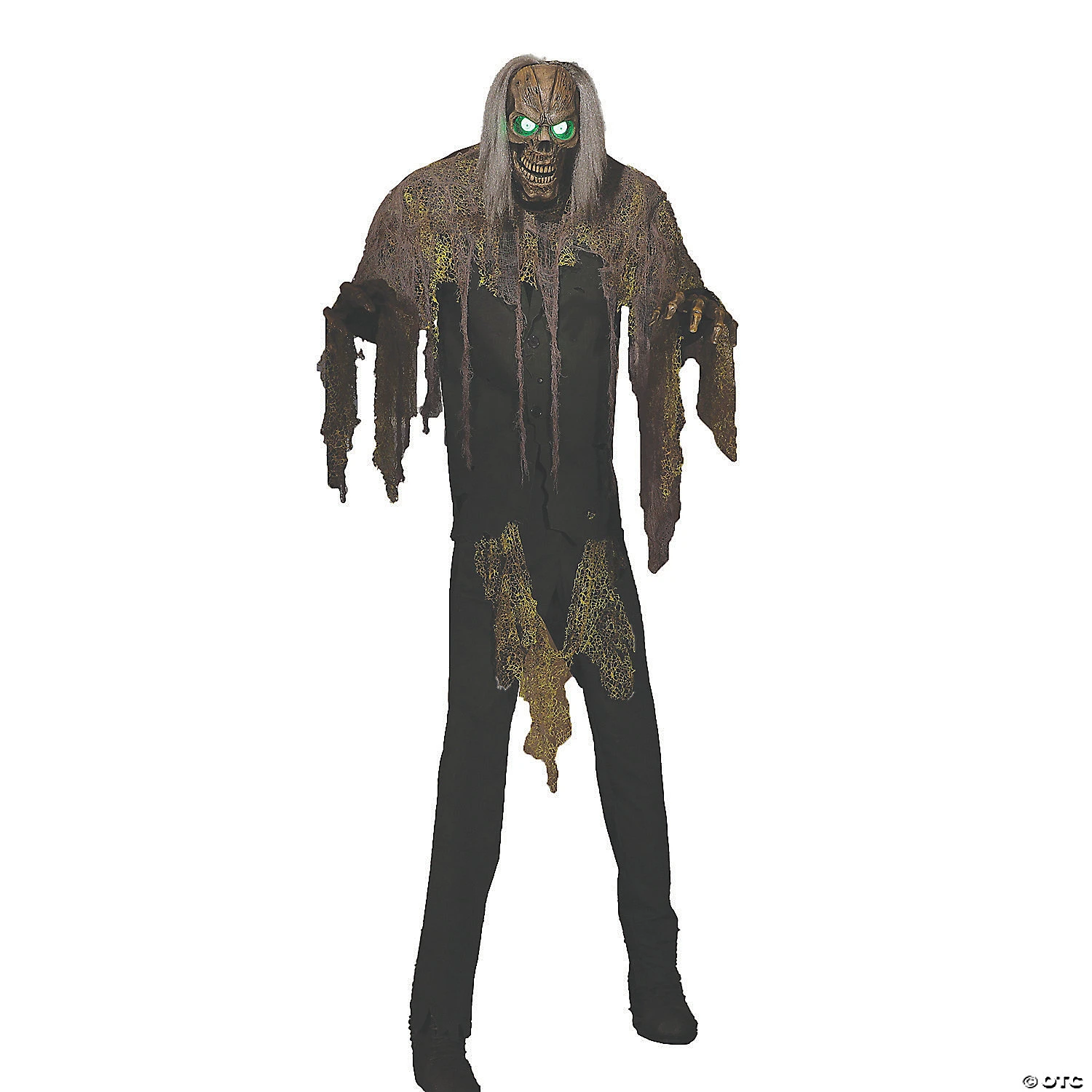 Lurking in the depths of your basement an undead terror awakens. The 7-foot Cellar Dweller Animated Prop covered in tattered rags has Glowing Green Eyes that pierce through the darkness, as his Head Turns and Mouth moves. His rough dry Voice speaks in a deathly tone as drips of water echo in the background. He speaks one of four scary phrases:Phrase #1: “This dank old house is oozing with foul stench of rotten souls. Its kept me thriving, as long as I hide down here with the rats. I’m happy to share with you, if you have the stomach for it! Huh huh huh!”Phrase #2: “Uuuuhhhh&hellip I ooze with the spirit of Halloween. Drip, drip drip it goes. Uuuuhhh&hellip”Phrase #3: “This place drips with doomed spirits. Released from their burial graves, they are searching for fresh victims to haunt. There is no way of hiding from them but go ahead and try! Huh huh”Phrase #4: “The syrupy, sick damp of the cellar has made me a moldy mess. But no matter. I’ve grown fond of the wet stench,and wantto share it with you! Uuuuhhhh!”His Arms also raise and lower, making his decrepit Boney Hands claw away at the darkness as an infrared sensor waits for the living to make a wrong move, activating his presence. Three activation options include, Steady-On, Infra-red Sensor, or Step-Here Pad. There is also a volume control so you can adjust to your surroundings. Constructed of durable metal rods that snap together, this piece is easily assembled in less than 30 minutes.The included Universal Adapter has 4 interchangeable plugs, and works in the USA, UK, Germany, and Australia.