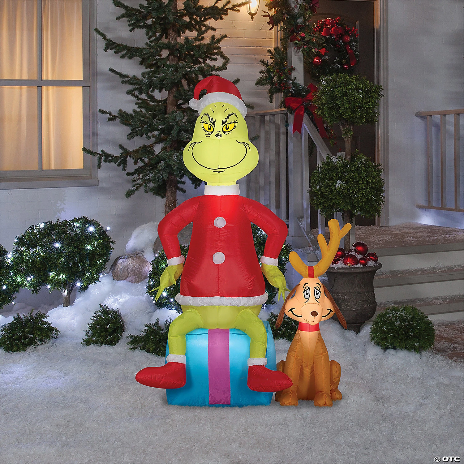 Grow your heart three sizes with an Airblown Inflatable Grinch dressed as Santa! Sitting atop a colorful present with his trusty dog Max by his side, this crafty character is ready to celebrate the season. Setup is super simple. Just plug it in, stake it down and watch the magic unfold. Display this Grinch holiday decoration as a standalone or combine it with other Airblown characters to create a custom scene. Includes everything needed for easy outdoor setup.