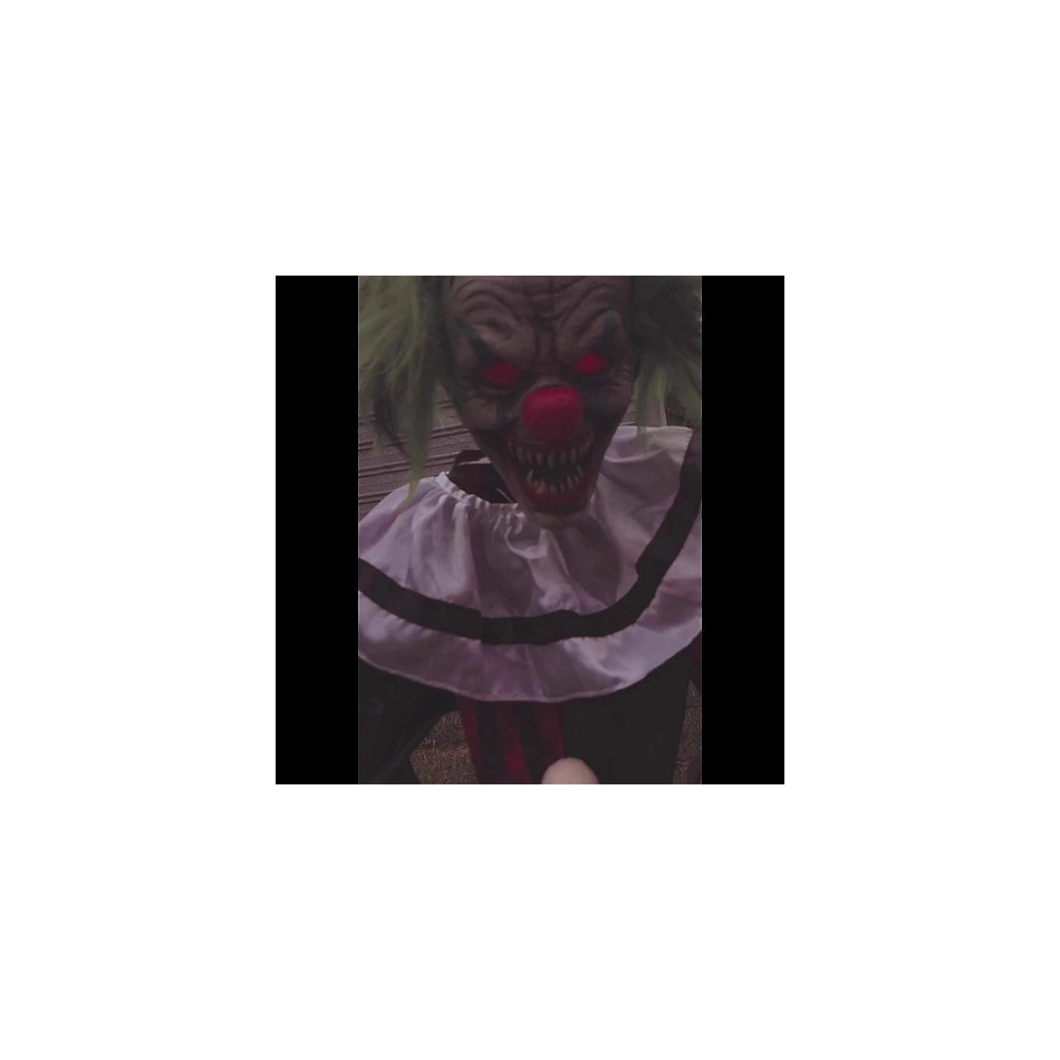 Very creepy clown crouches down and rocks side to side in a menacing way. His eyes light up and he has a sinister laugh while nightmarish carnival music plays in the background. Plug the UL power adapter into any standard outlet and choose from Steady-On Infra-Red Sensor or Step-Here Pad (included) activation options to operate. The infra-red activation options to operate. The infra-red sensor works up to 6.5′ feet away and works in all lighting conditions – bright light to no light! Item includes volume control. Easy-to-assemble quick-connect poles. Includes Step Here activation pad. Assembly required.
