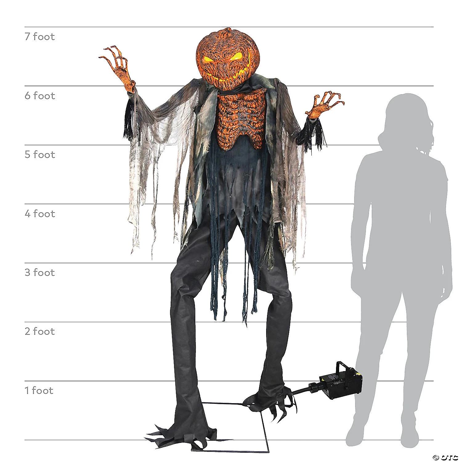 Featuring a light-up jack-o’-lantern head and animated chest, this scary Halloween decoration utters bone-chilling phrases and can be activated by step-here pad, steady-on mode or infrared sensor. Fog liquid is not included; uses standard UL power adapter.• Size: 7 ft. x 3 ft. x 38″; animation right to left is 4 ft.Includes:• 400W fog machine and hose attachment• Step activation pad No P.O. Boxes — item must ship to a physical address.