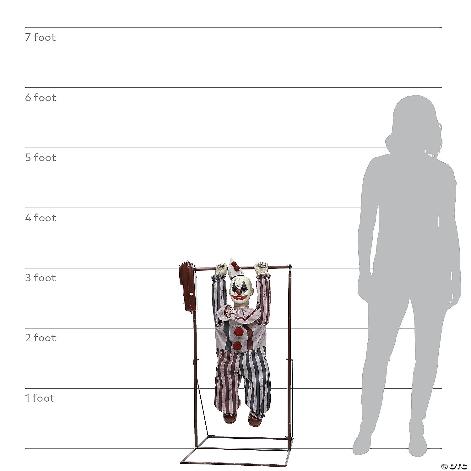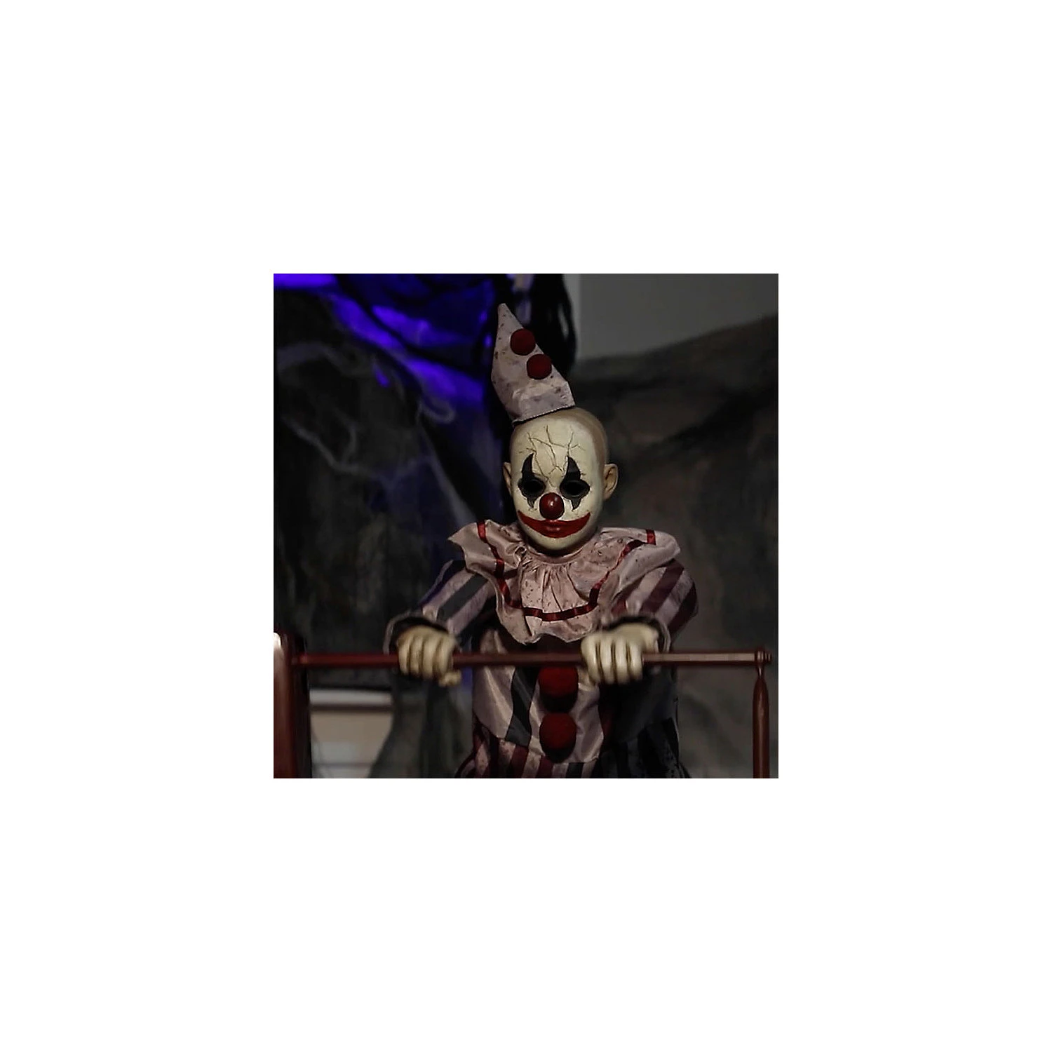 Step right up and bring the circus to your home! Watch as this 3-foot Tumbling Clown Doll does a party trick for you and your guests. This Tumbling Clown Doll flips over the bar in circles, as creepy circus music plays. Motion sensor activates top bar turning and sounds. Make the Tumbling Clown Doll a unique addition to your Halloween clown or circus collection. Packaging: Box with Color Label
