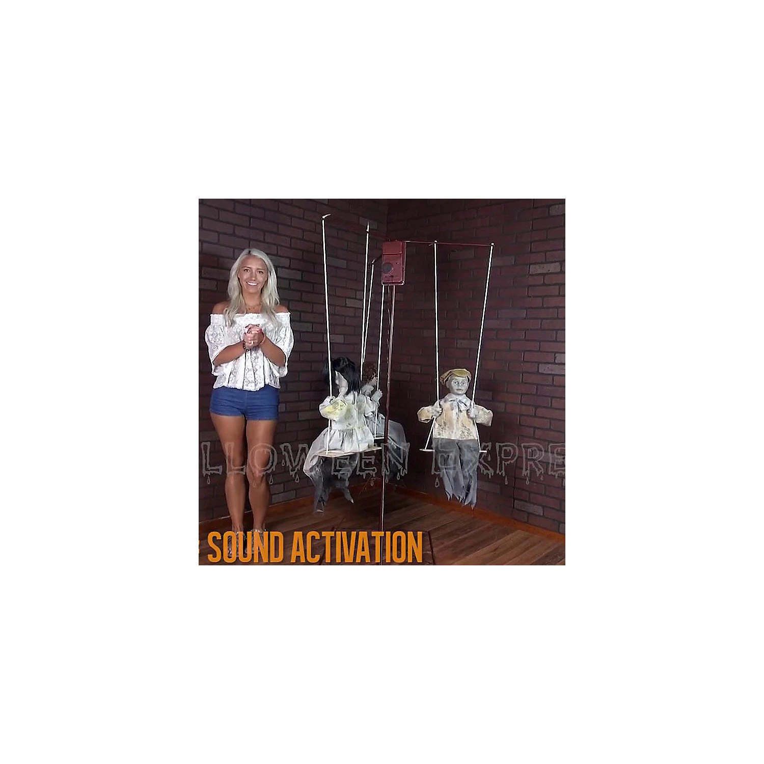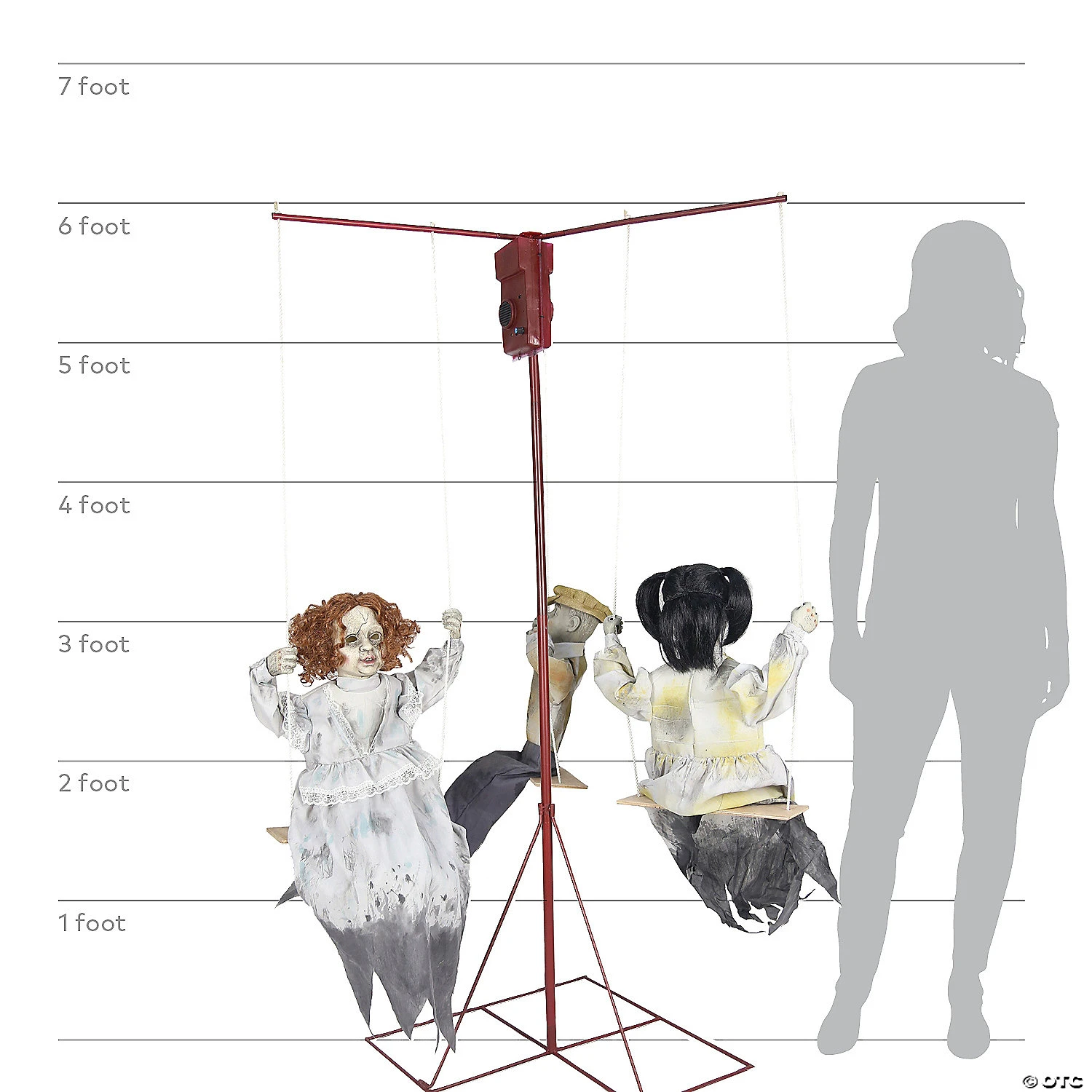 What is more chilling than three forgotten dolls from yesteryear slowly riding a merry-go-round for an eternity? This eerie prop is the perfect way to turn your home into a haunted mansion or haunted playroom. Creepy music plays at the merry-go-round goes round and round. Prop includes red iron frame merry-go-round with three swings and three dolls dressed in distressed Victorian era clothing with cracked faces. Add this animated prop to your indoor Halloween decorations to leave a haunting impression. Activation options: steady-on and Step-Here pad. Standard UL power adapter. Iron PVC polyester and cotton. Assembly required. 72 inchesH x 36 inchesW x 36