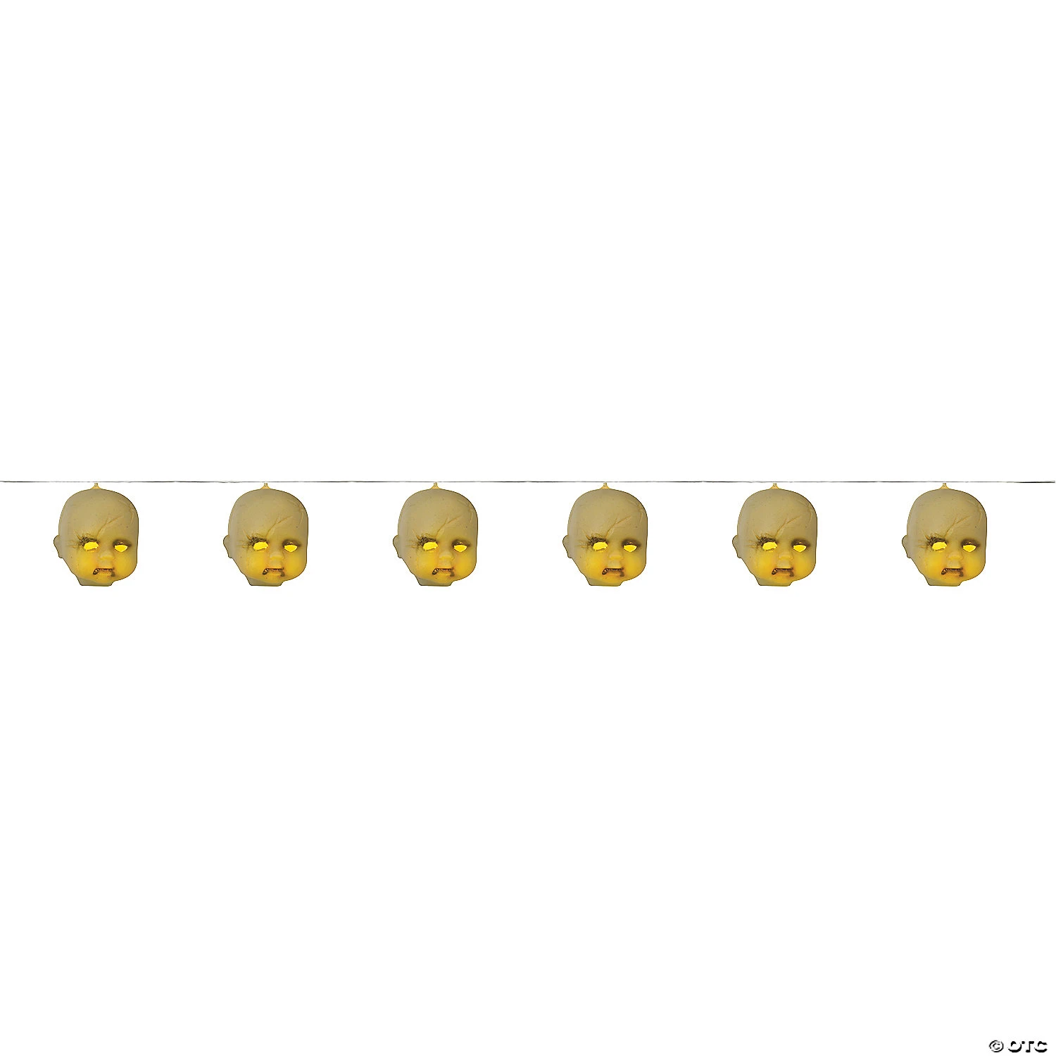 Add our Baby Head Light String to your Halloween Decoration theme! Trim your spooky setting with a String of 6 Baby Heads that Light Up for a super creepy effect! Purchase several strands to cover larger areas. Measures approximately 40 Inches x 2 inches x 2 inches. Requires 2 AA Batteries, which are not included. Use with other spine-chilling doll props and parts for some truly disturbing doll-themed Halloween Décor!